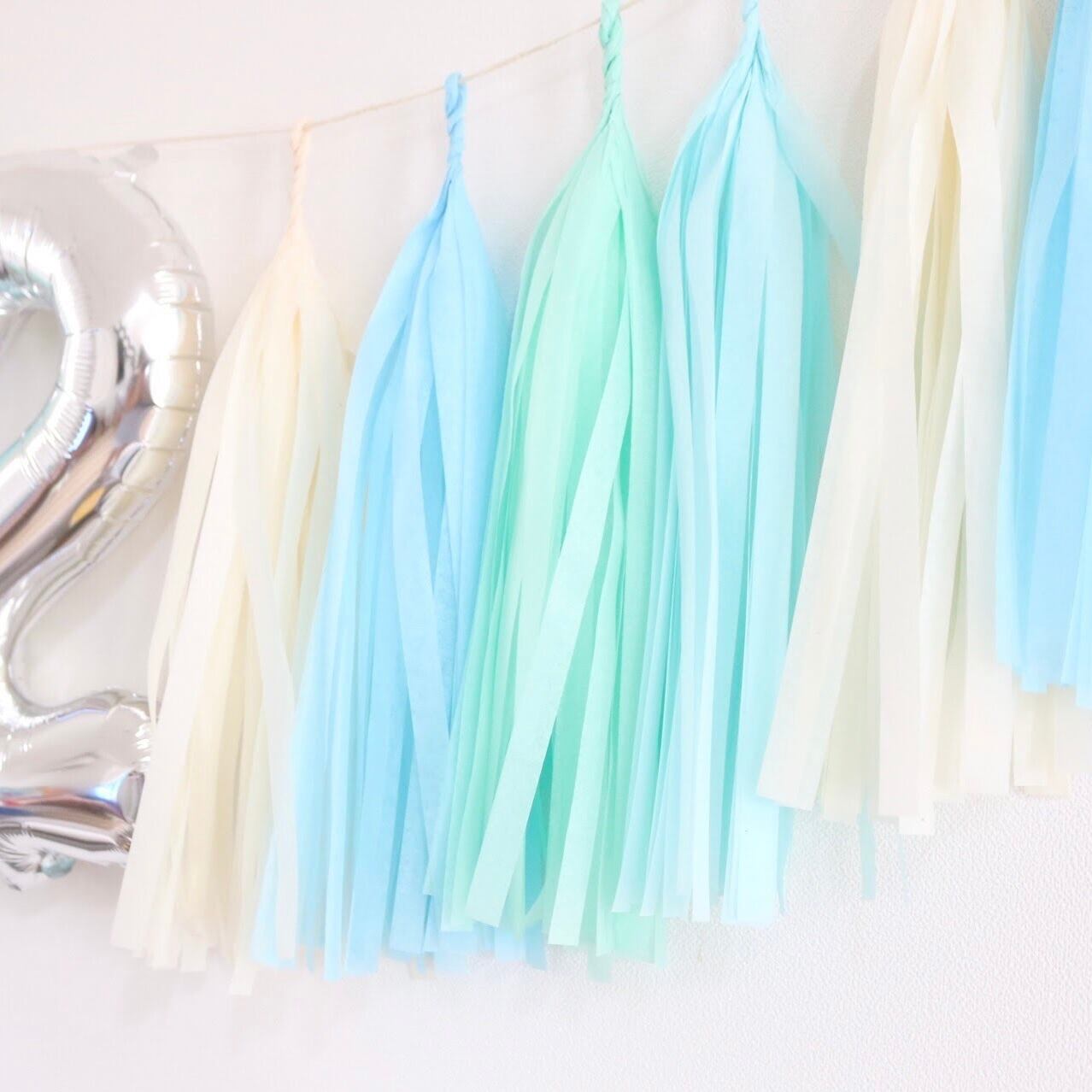 写真のように一本に繋いだガーランドでも、ナンバーバルーンとタッセルガーランドを別々でデコレーションしても可愛いセットです