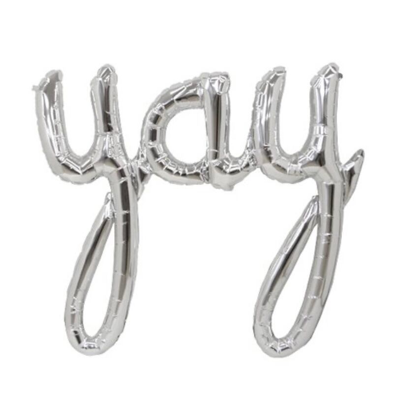 フォイルバルーン"yay" シルバー 米国north star balloons社、スタイリッシュな筆記体バルーンです ストローで簡単に膨らませることが出来る上、ボリュームがあるので一気に華やかな雰囲気になります サイズ:横75cm